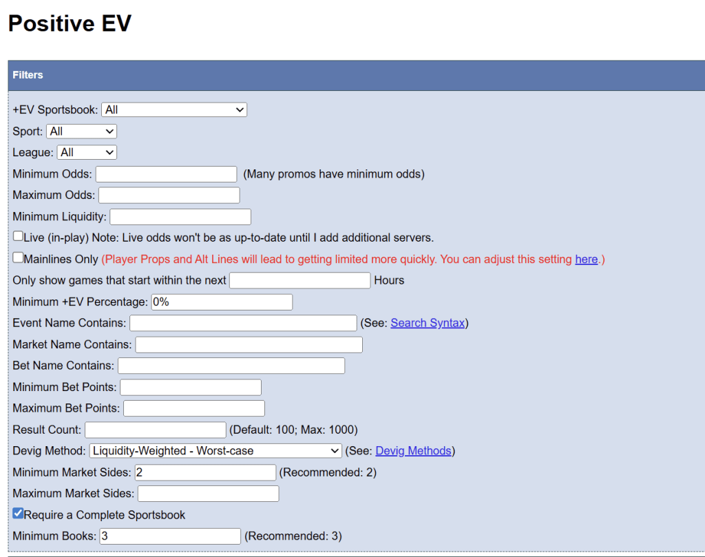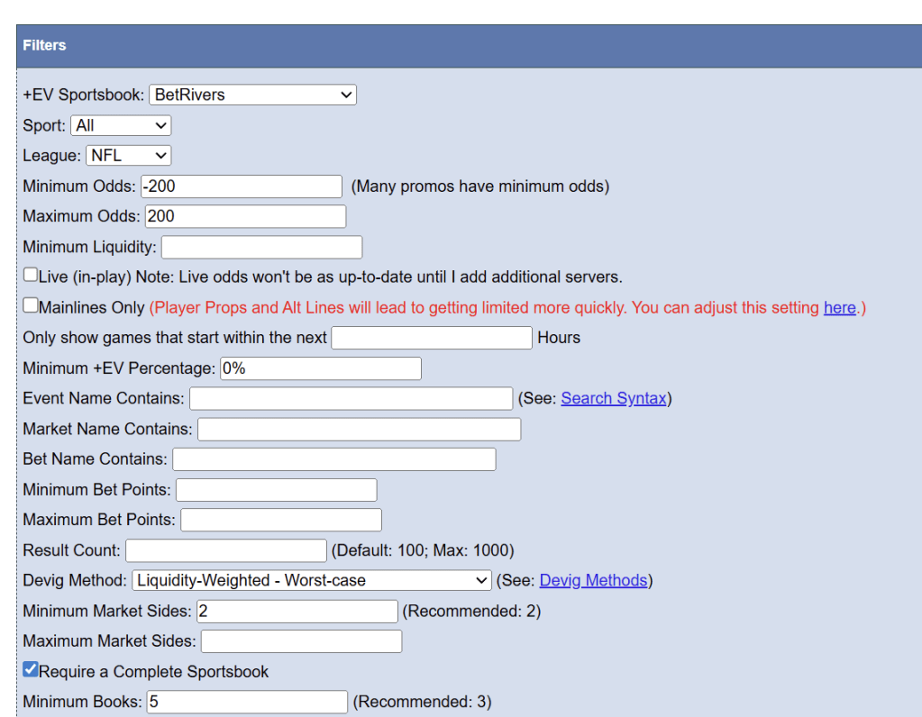 I chose a league that I know well, so I know what results are potentially too exotic or one sided. I also added min/max odd filters so extreme longshots get filtered out. These are often too volatile and risky to my bankroll. The rest I’ve left as default, for now, except for minimum books. I changed this from 3 to 5, because changing this setting also eliminated a lot of exotic props that are only offered at a limited number of books.